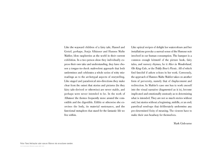 „Alarmierende Zustände und missratene Märchen“ heißt die Überschrift, unter der ab 9. September in ihrer ersten gemeinsamen Ausstellung Arbeiten von Sonja Alhäuser und Hannes Malte Mahler aus ihren unterschiedlichen Tätigkeitsfeldern gezeigt werden.