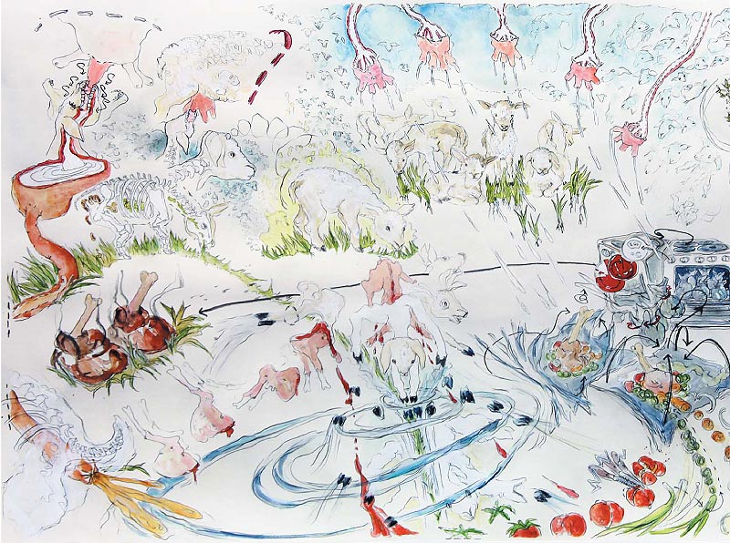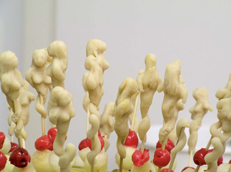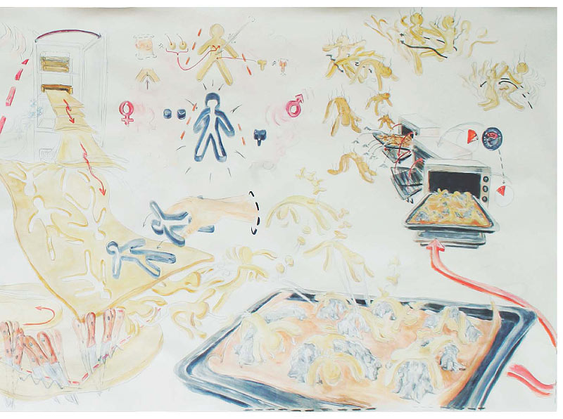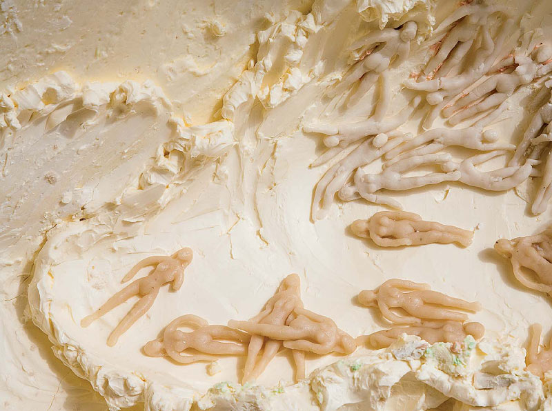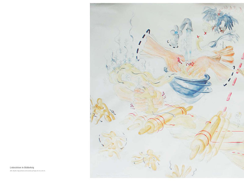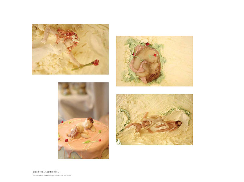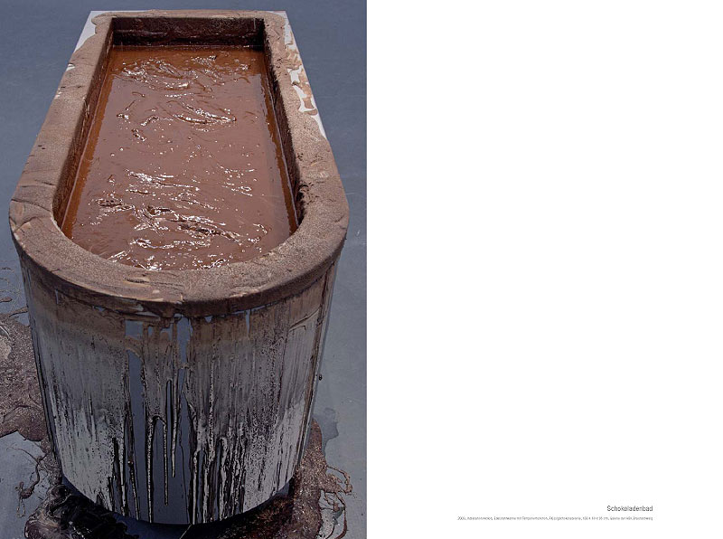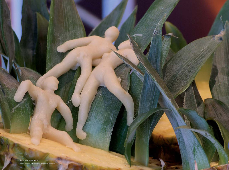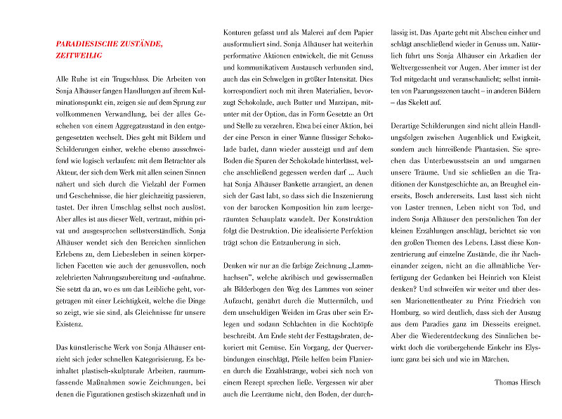 Sonja Alhäuser feiert Bankette ohne Anlass, zeichnet Rezepte, reitet über Bilder, kocht, backt, schießt, badet in Schokolade und promoviert Lebensmittel zu Materialien ihrer künstlerischen Arbeit.